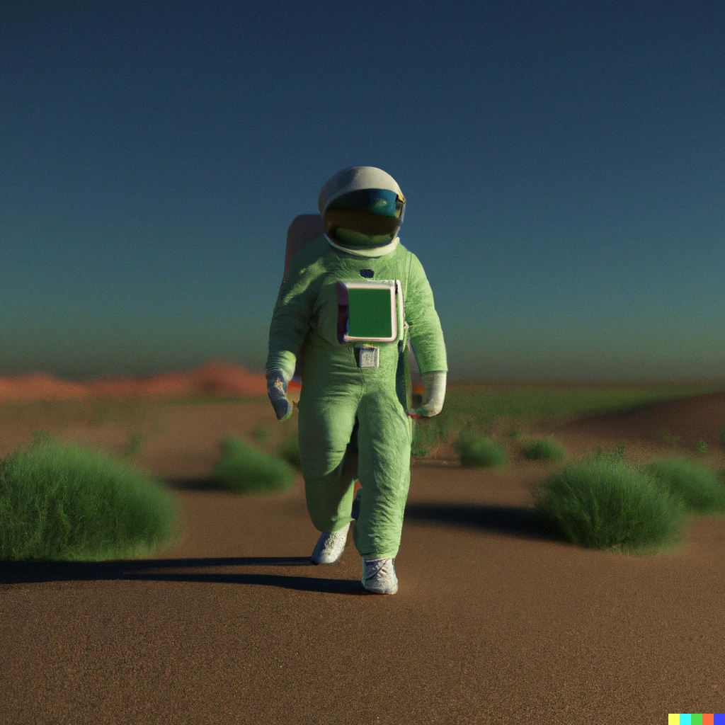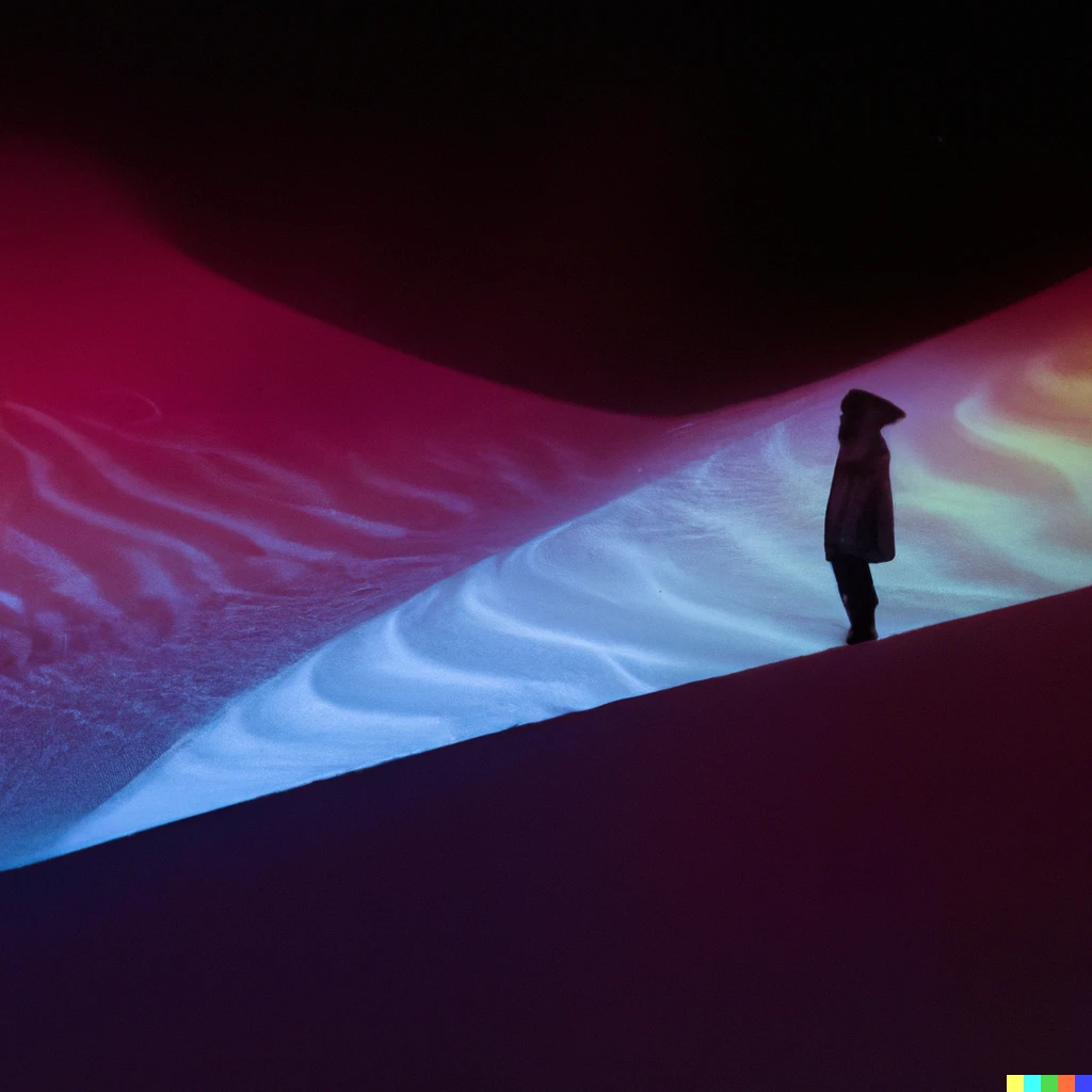 A 3D render of a rainbow colored hot air balloon flying above a reflective lake