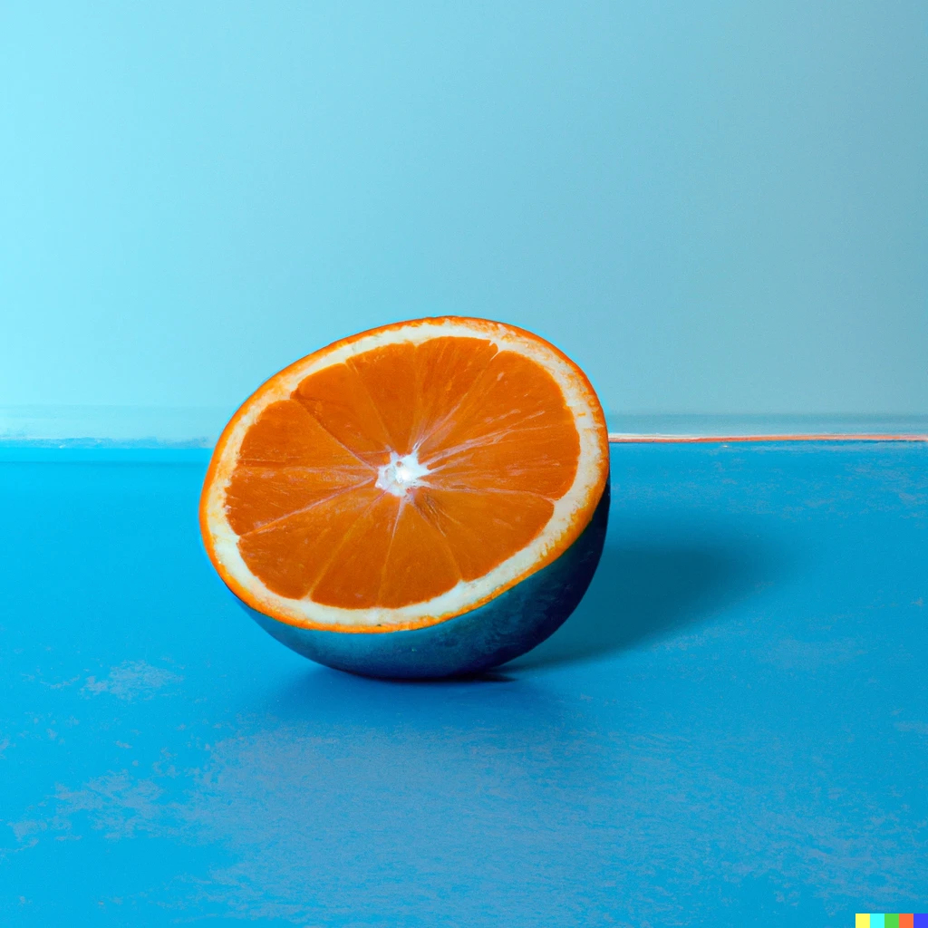 A blue orange sliced in half laying on a blue floor in front of a blue wall