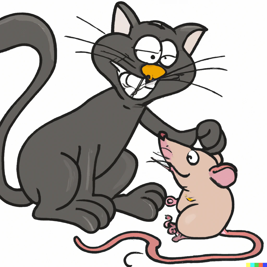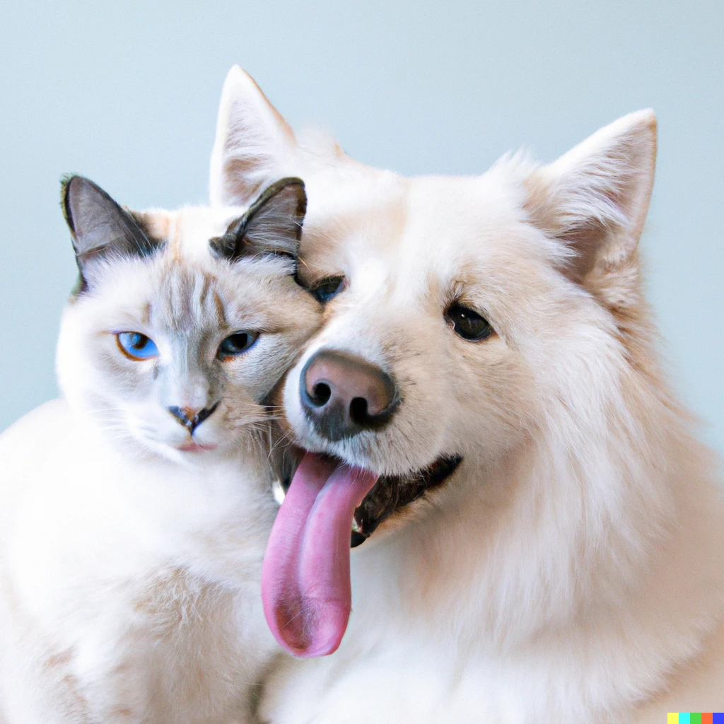 A photo of a Samoyed dog with its tongue out hugging a white Siamese cat