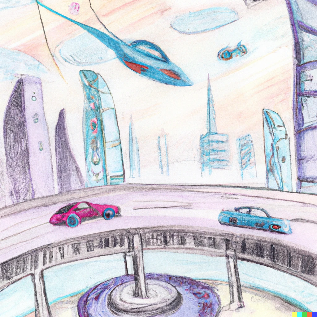A pencil and watercolor drawing of a bright city in the future with flying cars