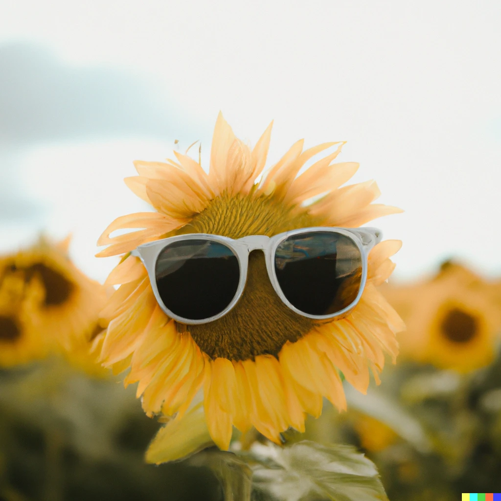 A photograph of a sunflower with sunglasses on in the middle of the flower in a field on a bright sunny day