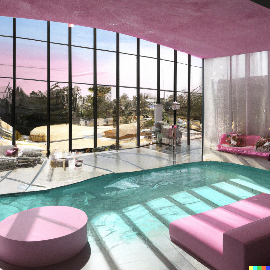 A sunlit indoor lounge area with a pool with clear water and another pool with translucent pastel pink water, next to a big window, digital art