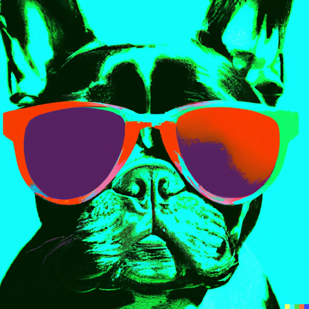 An Andy Warhol style painting of a french bulldog wearing sunglasses