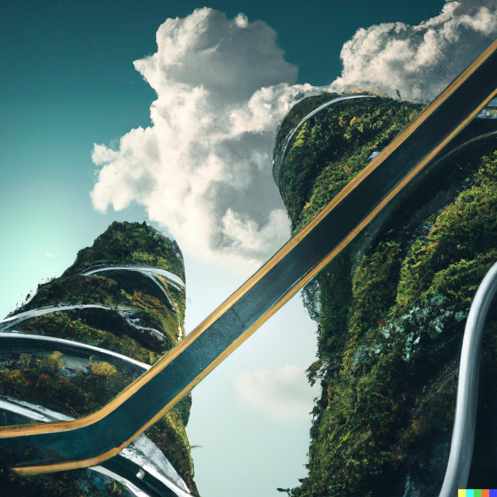 Two futuristic towers with a skybridge covered in lush foliage, digital art